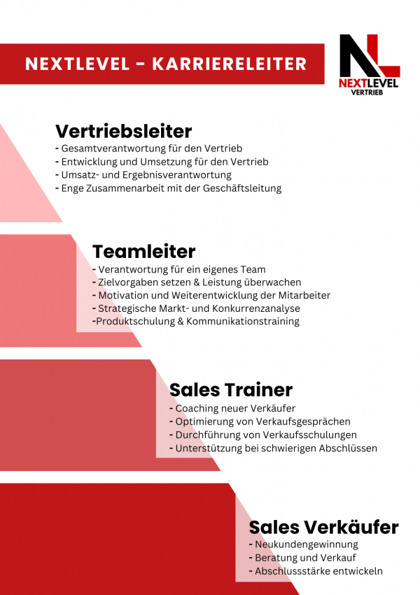 Unser Karriereweg bietet Top-Aufstiegschancen: Vom Sales Verkäufer bis hin zum Vertriebsleiter ist alles möglich. Unser junges, motiviertes Team arbeitet mit Leidenschaft daran, Menschen durch professionelle Beratung und exzellenten Service glücklich zu machen.